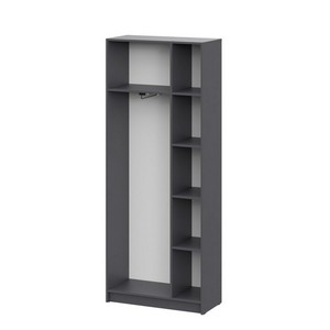 Распашные дверцы с полным доступом к внутреннему пространству, многоуровневая система полок для рационального хранения и встроенная штанга для размещения одежды на плечиках.