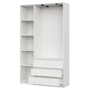 Распашные дверцы с полным доступом к внутреннему пространству, многоуровневая система полок для рационального хранения и встроенная штанга для размещения одежды на плечиках.