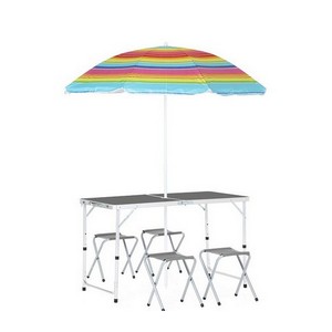 Включает удобный стол с регулируемыми ножками и отверстием для зонта, а также два прочных стула.