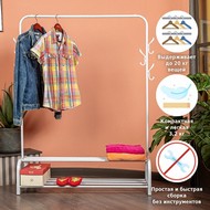 Напольная вешалка для одежды Helex Home W-20 белая имеет 2 полки для обуви, штангу для вешалок-плечиков и крючки на боковых стойках конструкции.