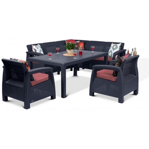 Комплектация: стол, угловой диван, кресло - 2 шт, подушки на сиденья и спинки.