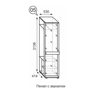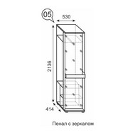 Пенал оснащен зеркальным фасадом в полный рост с вертикальными планками и полочкой для мелочей.