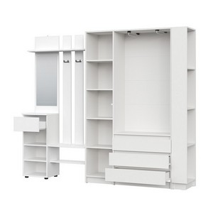 Включает вешалку с зеркалом, трехстворчатый шкаф, а также угловое завершение.