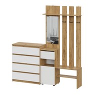 Включает вешалку с зеркалом и комод с четырьямя ящиками .