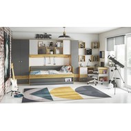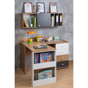 Комплект состоит из: письменного стола с 4-мя ящиками, углового приставного стола и навесной полки с закрытой нишей и открытыми секциями.