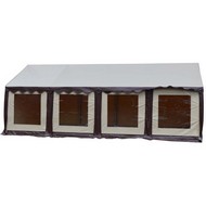 В набор входят все необходимые элементы для полной сборки шатра: стальной каркас, тент крыши с пришитыми вертикальными стойками, 2 стенки боковые без окна, 2 стенки боковые с окном, 2 стенки торцевые с дверью на молнии.