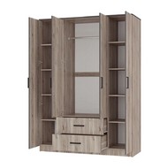 Шкаф состоит из двух секций по бокам с пятью удобными полками в каждом, центральной секции с продольной штангой для вешалок и двух выдвижных ящиков.