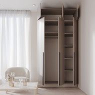Вместительная система хранения включает металлическую штангу для плечиков и просторные полки.