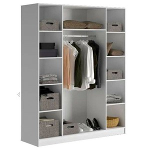 Вместительная система хранения включает металлическую штангу для плечиков и просторные полки.