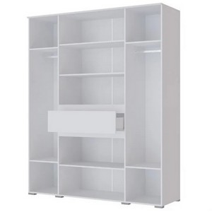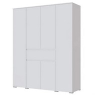 Четырехстворчатый шкаф Плейона оснащем выдвижным ящиком, закрытыми полками и двумя вешалами.