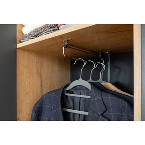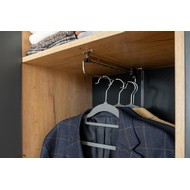 Шкаф оснащен набором полок и штангой для вешалок.