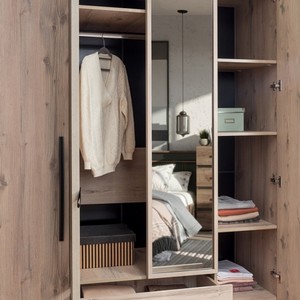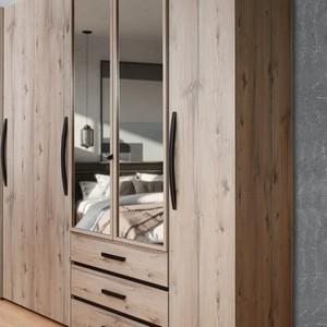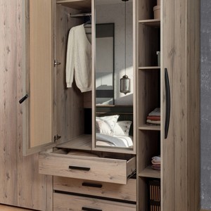 Распашной шкаф с двумя зеркальными фасадами, выдвижными ящиками и глухими фасадами.