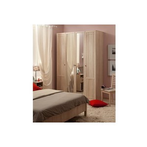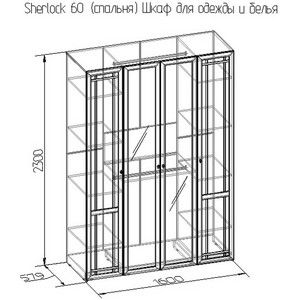 Глухие фасады шкафа декорированы раскладкой, центральные зеркальные рамочные фасады без раскладки.