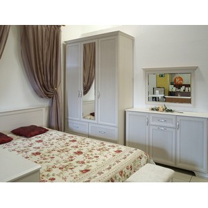 Шкаф оснащён двумя отделениями (двухдверным с зеркалом и однодверным) и четырьмя выдвижными ящиками.