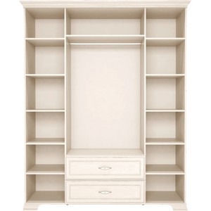 Шкаф оснащён тремя отделениями (двухдверным с зеркалами и двумя однодверными) и двумя выдвижными ящиками.