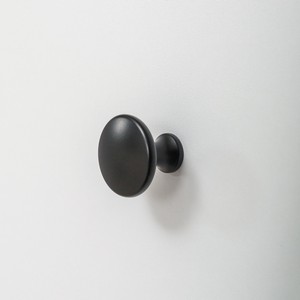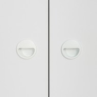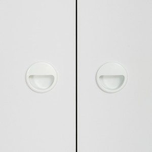 На фасадах выдвижных ящиков установлена черная пластиковая ручка-кнопка, а на распашных дверцах пластиковая врезная ручка в белом цвете.