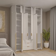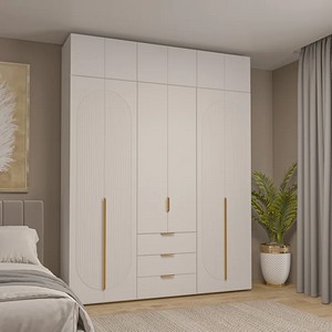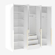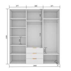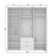 Продуманное внутреннее наполнение: просторные полки для размещения одежды, три вместительных выдвижных ящика с системой плавного закрывания, хромированная металлическая штанга для удобного размещения одежды на плечиках.