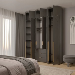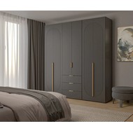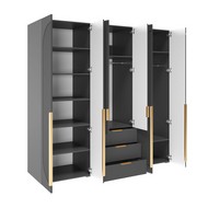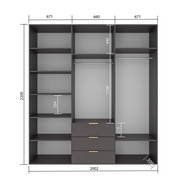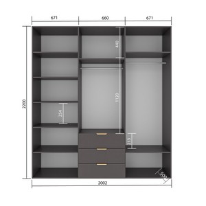 Продуманное внутреннее наполнение: просторные полки для размещения одежды, три вместительных выдвижных ящика с системой плавного закрывания, хромированная металлическая штанга для удобного размещения одежды на плечиках.