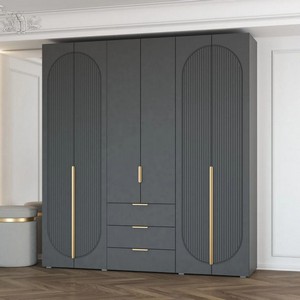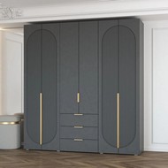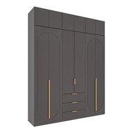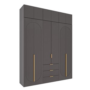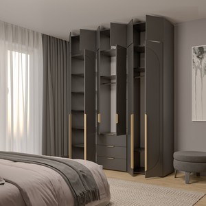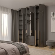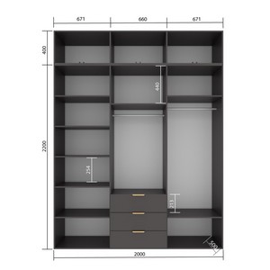 Продуманное внутреннее наполнение: просторные полки для размещения одежды, три вместительных выдвижных ящика с системой плавного закрывания, хромированная металлическая штанга для удобного размещения одежды на плечиках.