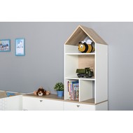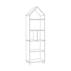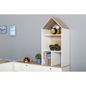 Комбинированный шкаф Эйп 13.14 для детской выполнен в форме домика и состоит из открытых и закрытых полок.