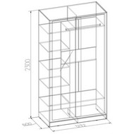 Шкаф оснащен стационарной штангой для вешалок, тремя полками, двумя нишами вверху и двумя внизу.