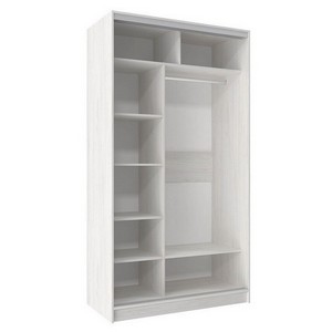 Внутреннее наполнение шкафа состоит из стеллажа для белья, четырех больших ниш внизу и вверху, а также стационарной штанги.