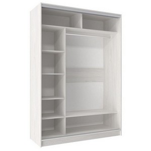 Внутреннее наполнение шкафа состоит из стеллажа для белья, четырех больших ниш внизу и вверху, а также стационарной штанги.