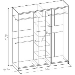 Шкаф оснащен тремя стационарными штангами для вешалок, двумя антресольными нишами и четырьмя полками.