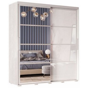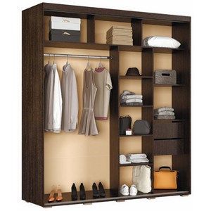 Шкаф оснащен штангой для вешалок, полками и двумя выдвижными ящиками.