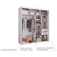 Шкаф оснащен штангой для вешалок, полками и двумя выдвижными ящиками.