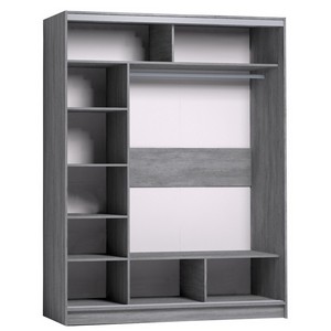 Внутреннее наполнение шкафа состоит из стеллажа для белья, четырех больших ниш внизу и вверху, а также стационарной штанги.