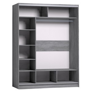 Внутреннее наполнение шкафа состоит из стеллажа для белья, четырех больших ниш внизу и вверху, а также стационарной штанги.