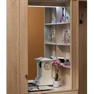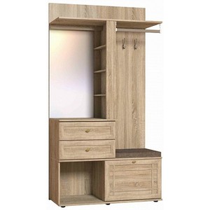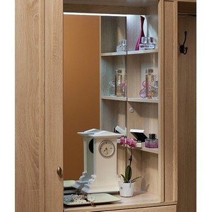 Многофункциональный шкаф оснащен: тумбой для обуви, открытой нишей для обуви, зеркалом с подсветкой, штангой для вешалок, тремя крючками для одежды, полкой для головных уборов, двумя выдвижными ящиками и полками.