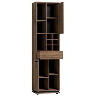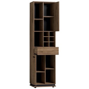 Шкаф оснащен открытыми полками, барной нишей, выдвижным ящиком и двумя закрытыми секциями с полкой.