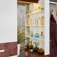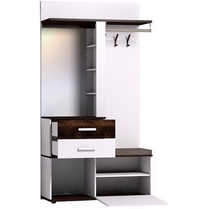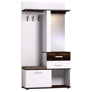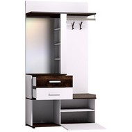 Крючки, стационарная штанга, открытые полки, выдвижные ящики, отделение за откидным фасадом, открытая ниша, зеркало с подсветкой.