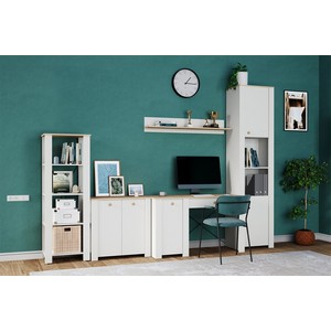 Шкаф торцевой Джастин 16.306 состоит из верхней и нижней полки с распашными дверцами, а центральную часть занимают две открытые ниши.