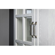 Комбинированный фасад с прозрачными стеклянными вставками и изящной ручкой цвета античной бронзы.