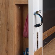 Внутри шкафа полки с ограничителями и ниша с крючками.