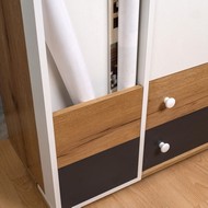 Зона хранения на самом фасаде включает в себя: карман для высоких бумаг и ватманов, ручку, выполненную виде полочки, и два крючка.
