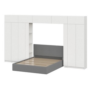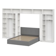 Комплект включает: кровать с основанием 160x200 см, два шкафа двухстворчатых, два угловых окончания, четыре верхних шкафа 800, один навесной шкаф 1000 и узкий пенал.