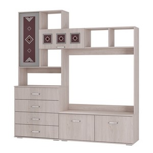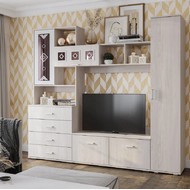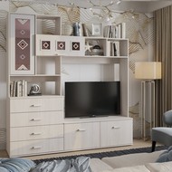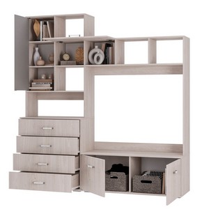 Центральная секция Белла состоит из комода с четырьмя выдвижными ящиками, тумбы под телевизор и множества полок для хранения книг, посуды и других предметов.