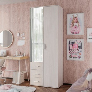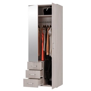 Шкаф 2-х дверный Белла имеет отделение с хромированной штангой для одежды на вешалках, три выдвижных ящика и верхнюю полку.