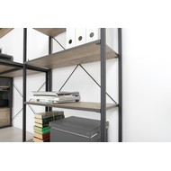 Стеллаж Трувор 13.151.01 N состоит из металлических стоек и четырех полок из ЛДСП в цвете дуб грандж.