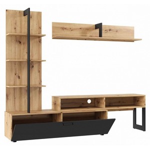 Компоненты, входящие в комплект: полка навесная:, 1 полка, стеллаж:, 3 полки, тумба под ТВ:, 1 дверца, 2 полки.