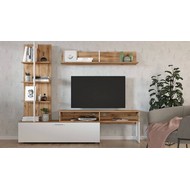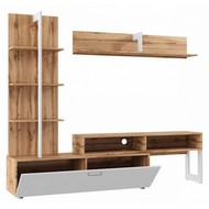 Компоненты, входящие в комплект: полка навесная:, 1 полка, стеллаж:, 3 полки, тумба под ТВ:, 1 дверца, 2 полки.