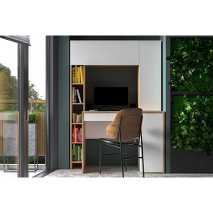 Стол компьютерный Комфорт 12.71 оснащен открытыми и закрытыми полками с распашным дверцами, ящиком и секцией для ПК.