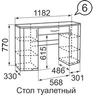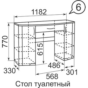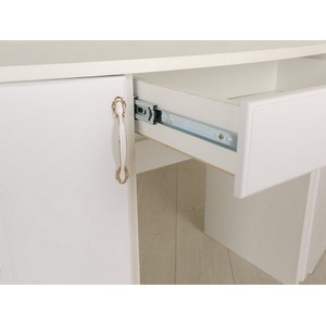 Туалетный столик оснащён двумя тумбами и одним выдвижным ящиком.