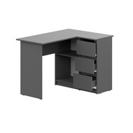 Угловой письменный стол Денвер графит оснащен тумбой с тремя ящиками и двумя открытыми полками.