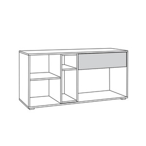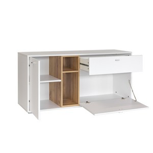 Тумба Бэль 10.91 (белая, дуб золотой) состоит из выдвижного ящика, полок с распашной и откидной дверцами и отрытыми нишами.
