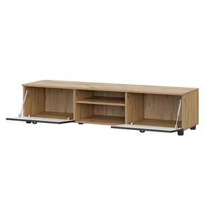 Тумба для ТВ Милан (дуб золотой/белый матовый) отличается наличием фрезеровки на фасаде и акцентной фурнитуры. Есть возможность установить данную модель мебели либо на опорах, либо подвесить на навесах (опоры при этом способе установки на тумбу не монтируются).